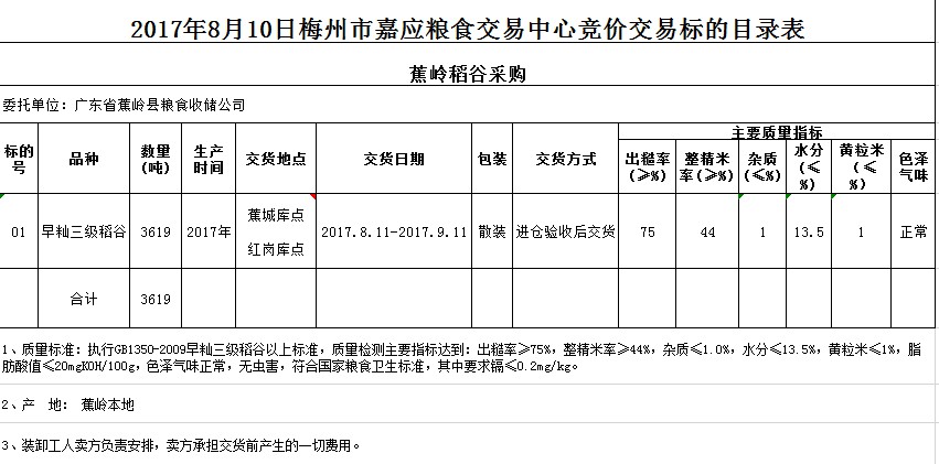 受客戶委托,梅州市嘉應(yīng)糧食交易中心有限公司定于2017年8月10日舉辦糧食競(jìng)價(jià)交易會(huì),廣東省蕉嶺縣糧食收儲(chǔ)公司擬采購(gòu)2017年早秈三級(jí)稻谷共3619噸。