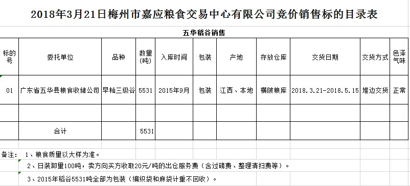 受客戶委托,梅州市嘉應(yīng)糧食交易中心有限公司定于2018年3月21日(星期三)舉辦糧食競(jìng)價(jià)交易會(huì),廣東省五華縣糧食收儲(chǔ)公司擬銷售早秈稻5531噸。