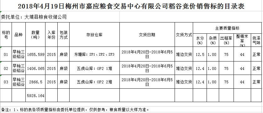 受客戶委托,梅州市嘉應糧食交易中心有限公司定于2018年4月19日(星期四)舉辦糧食競價交易會,大埔縣糧食收儲公司擬銷售早秈稻5928.164噸。