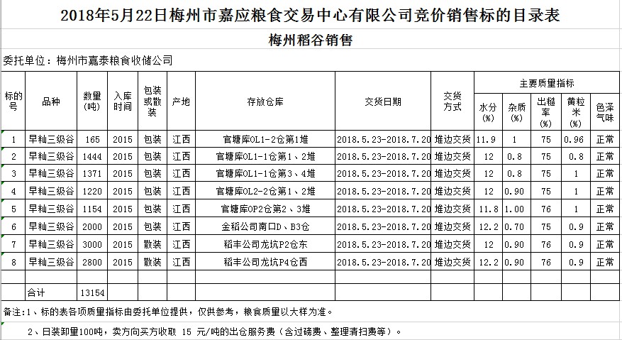 受客戶委托,梅州市嘉應(yīng)糧食交易中心有限公司定于2018年5月22日(星期二)舉辦糧食競價(jià)交易會(huì),梅州市嘉泰糧食收儲(chǔ)公司擬銷售早秈稻13154噸。