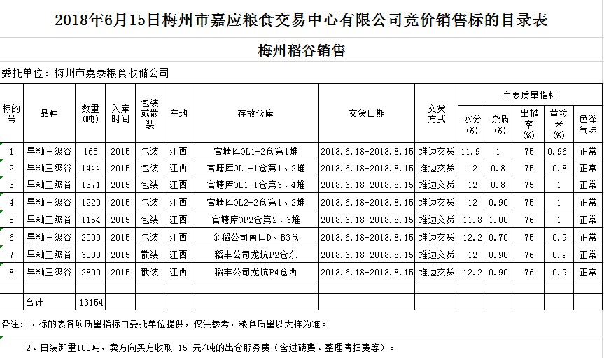 受客戶委托,梅州市嘉應糧食交易中心有限公司定于2018年6月15日(星期五)舉辦糧食競價交易會,梅州市嘉泰糧食收儲公司擬銷售早秈稻13154噸。