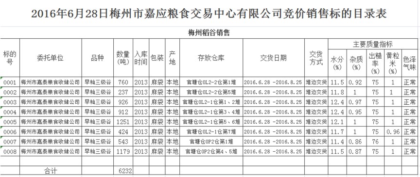 受客戶委托,梅州市嘉應糧食交易中心有限公司定于2016年6月28日(星期二)舉辦糧食競價交易會,梅州市嘉泰糧食收儲公司擬銷售官塘倉庫2013年早秈稻谷6232噸。